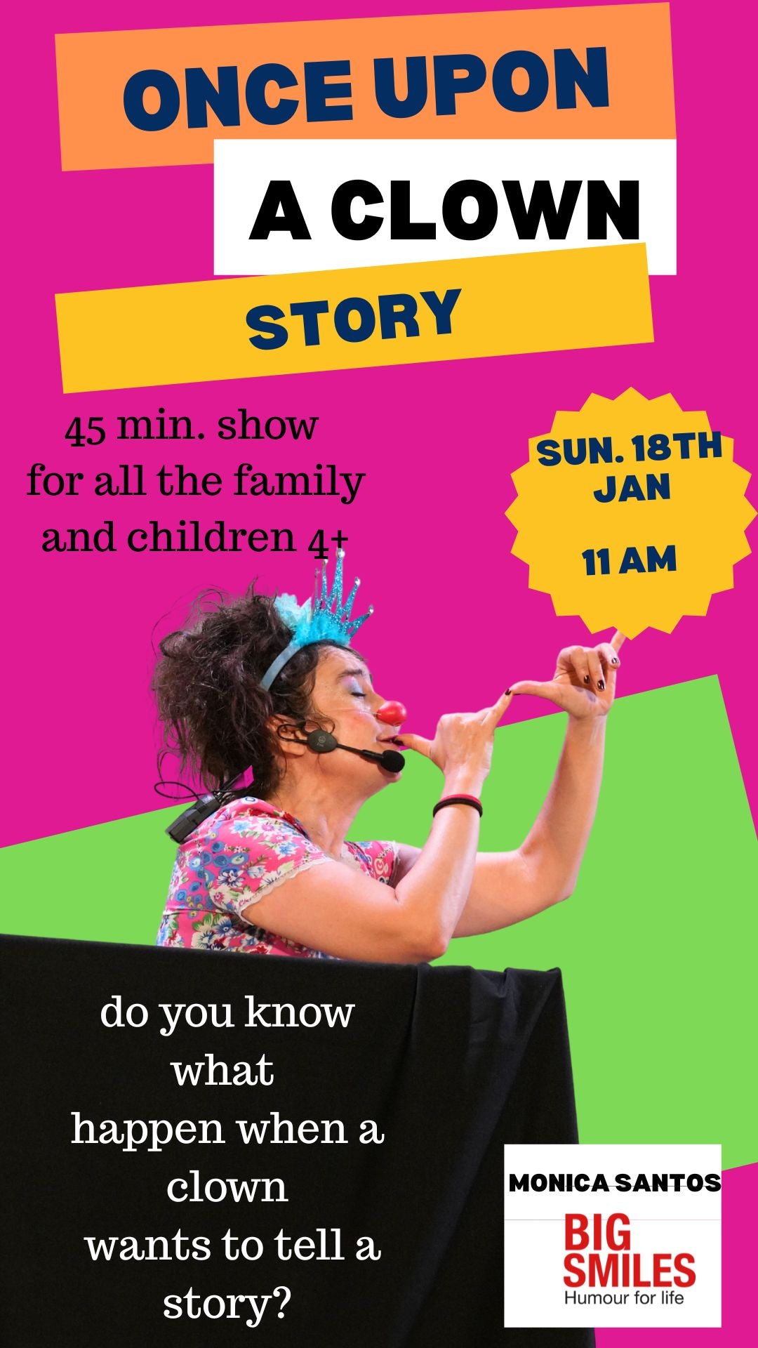 Created and performed by Mónica Santos, healthcare clown, performer and founder of Big Smiles, this show has been performed more than 200 times in India and Spain since 2018, in theatres, literature festivals, schools, hospitals, community centers and open-air spaces.